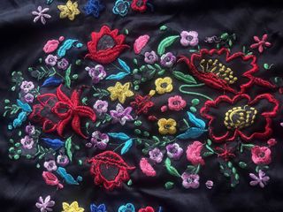 Elegante mantón de Manila con un intrincado bordado floral. - Diseño multicolor sobre fondo negro. - Adornado con motivos florales y hojas. - Ideal para complementar atuendos tradicionales o modernos.