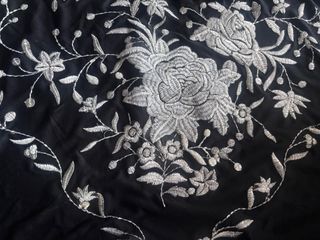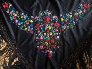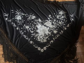 Elegante mantón negro con un delicado bordado blanco y flecos. - Diseño floral bordado. - Adornado con flecos blancos. - Borde de encaje. Medidas 2 metros de ancho por 1 metro de alto