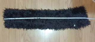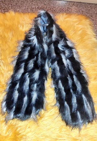 Bufanda de pelo en color negro y blanco de 16 cm de ancha y 118 cm de larga. Tiene una apertura para cerrarla.