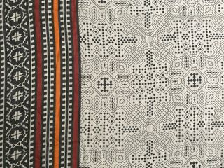 Fular con un diseño geométrico y tribal. - Estampado en blanco y negro con detalles en rojo y naranja. - Diseño de líneas y rombos. - Borde con motivos circulares.