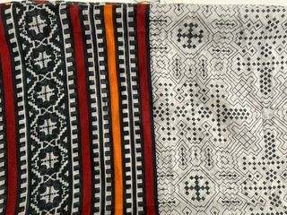 Dos fulares pañuelos grandes, uno negro con bigotes blancos tiene bolitas, otro con dibujos geométricos en colores coral azul gris y blanco y terminación con flequitos, tienen poco uso