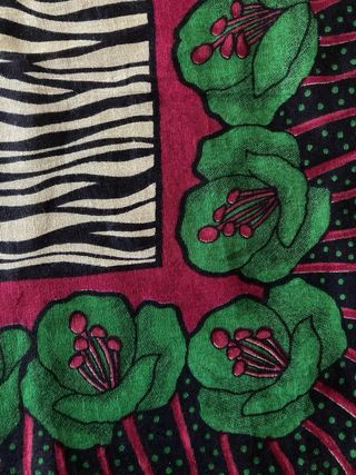 Foulard con un bonito estampado de flores en tonos rosa y verde. El diseño presenta un fondo con líneas onduladas en blanco y negro. - Estampado floral. - Diseño con líneas onduladas. - Medidas: 148 x 103 cm.