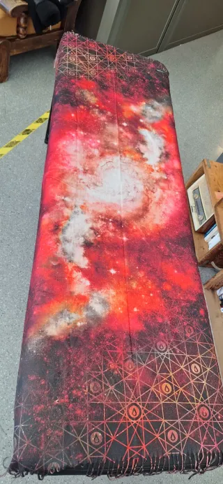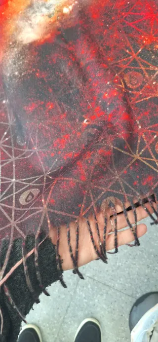 Pañuelo con un diseño vibrante que evoca una galaxia. - Estampado de nebulosas y estrellas en tonos rojos y blancos. - Borde con un patrón geométrico en dorado y negro. - Textura suave y cálida, ideal para el invierno.