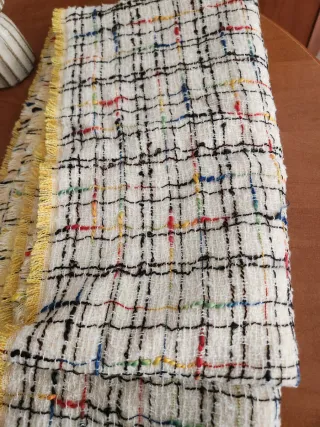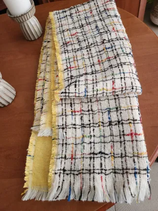 Pashmina con un diseño tejido a cuadros en blanco y negro, adornada con hilos de colores vibrantes como rojo, azul y verde. Los bordes presentan un acabado deshilachado y interior es tono amarillo . Tejido suave y muy agradable. Medidas 190x 50 cm