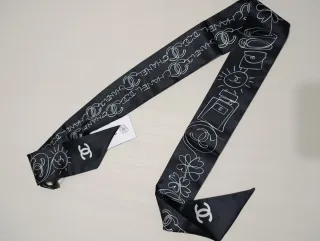 Elegante pañuelo de seda con un diseño distintivo. - Estampado de motivos icónicos de Chanel. - Combinación de colores negro y blanco. - Acabado satinado.