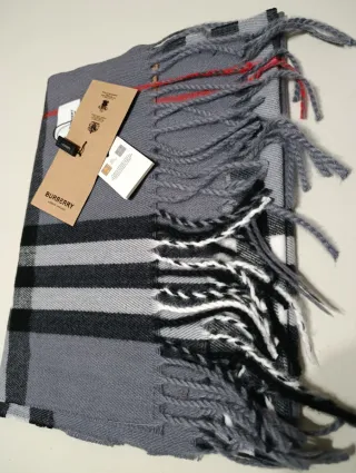 Bufanda con el icónico diseño de cuadros de Burberry. - Diseño a cuadros en tonos grises y negros. - Detalles de flecos en los extremos. - Toques de hilo rojo y blanco entre los flecos.