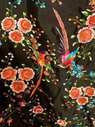 Mantón de Manila antiguo es una pieza de museo bordado a mano. Elaborado en seda negra gruesa, luce brillantes motivos florales y un par de pájaros bellamente detallados en cada esquina, lo que le aporta un toque de simbolismo y vitalidad. Los densos flecos anudados caen con elegancia al lucirse o exhibirse. Material: seda con hilo de bordar de colores. Color: Fondo negro con flores y pájaros multicolores. Medidas: Aprox. 150 × 150 cm sin incluir los flecos Largo del fleco: Aprox. 55 cm de fleco de macramé anudado a mano Peso: aproximadamente 2,26 kg Estado: Excelente estado antiguo; el bordado y los flecos están intactos con míni