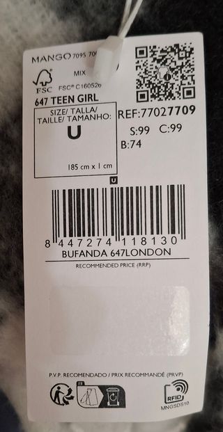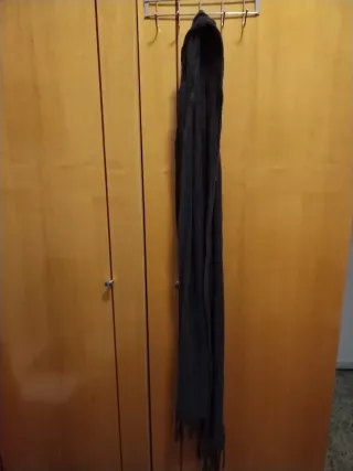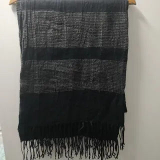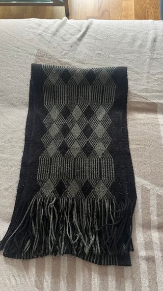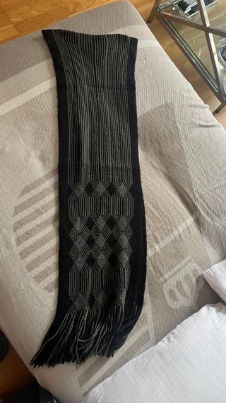 Bufanda de punto trenzado en color negro. Presenta un detalle de tres franjas (roja, azul y roja) en uno de los extremos. - Diseño de punto trenzado. - Detalle de franjas en el extremo. Tiene algo de bolitas que con cuchilla o maquina se le pueden quitar, por eso el precio (yo nunca ae las he quitado)