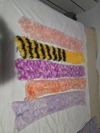 Conjunto de bufandas de pelo con un diseño llamativo y texturas suaves. - Bufanda rosa - Bufanda con rayas amarillas y negras - Bufanda morada - Bufanda naranja - Bufanda lila con detalles blancos - se vende por unidad 2.50 la unidad.