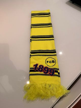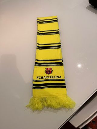 Bufanda del FC Barcelona con rayas amarillas y negras. - Diseño a rayas. - Flecos en los extremos. - Está nueva, sin usar, pero sin etiqueta