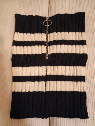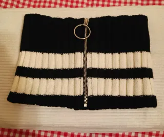 De punto, blanco y negro Se puede llevar doblado o desdoblado, con detalle de cremallera. 27 cm ancho x 18 largo doblado Desdoblado 36 cm largo Perfecto estado, sin uso