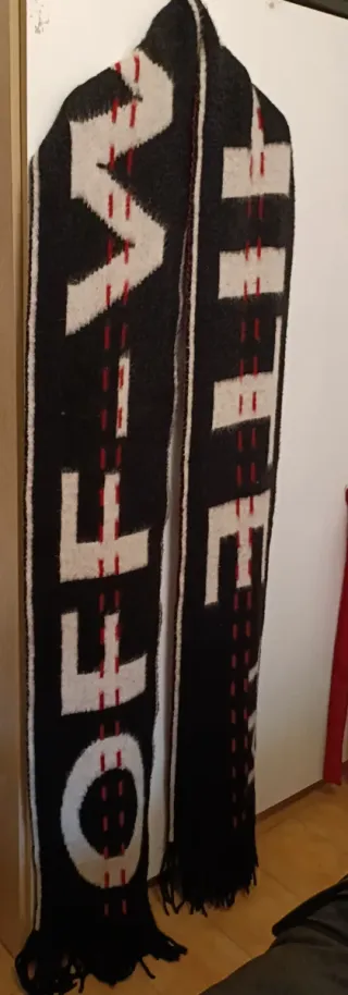 Bufanda de punto con diseño de la marca Off-White. - Diseño con letras blancas y detalles en rojo. - Flecos en los extremos.