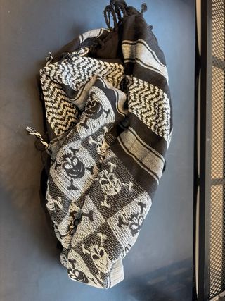 Pañuelo estilo palestino con un diseño de calaveras. - Diseño a cuadros con calaveras. - Bordes con flecos. - Patrón de espiga en los laterales.