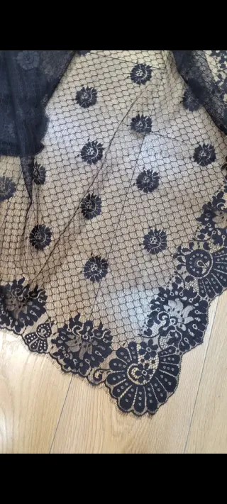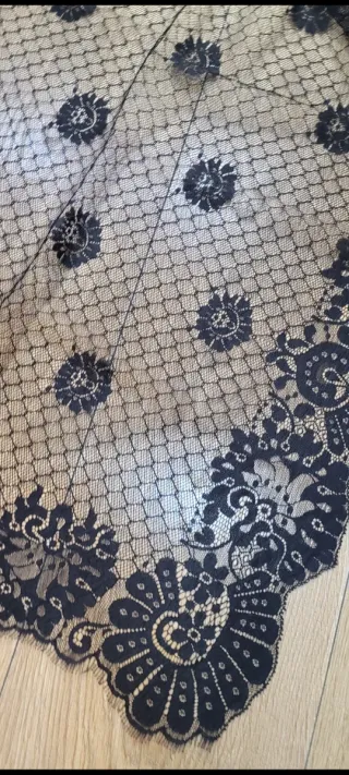 Elegante mantilla antigua con un intrincado diseño de encaje. 192 x 100cms. - Motivos florales y arabescos. - Borde festoneado. - Ideal para eventos especiales o como pieza de colección.