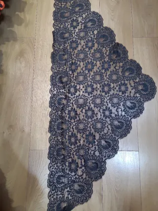 Mantilla rectangular de encaje negro, ideal para lucir con peineta en Semana Santa. -Medida 130x250cm - Diseño con motivos florales. - Borde festoneado.