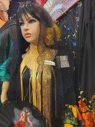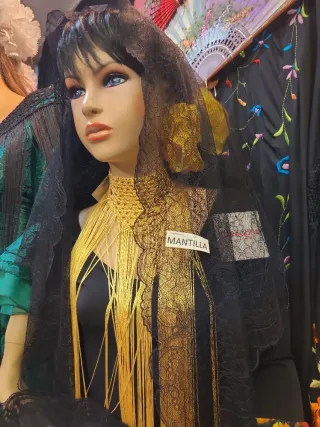 Elegante mantilla triangular de encaje, perfecta para complementar atuendos. - Medidas: 120x0.60cm. - Diseño intrincado con detalles dorados.