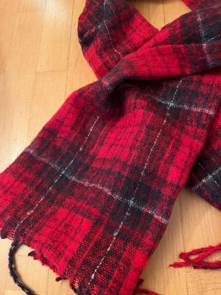 Bufanda con diseño tartán en tonos rojos y negros. - Tejido suave y cálido. - Flecos en los extremos.