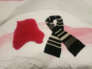 Conjunto de dos bufandas, una de color rojo y otra de rayas. - Bufanda roja de tacto suave, tubular y elástica. - Bufanda de rayas en tonos gris, negro y beige. 7 euros cada una o 10 euros las dos