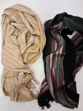 Conjunto de dos bufandas con diseños variados. - Una bufanda de color beige con finas rayas marrones (Longitud: 180 cm 100% Acrílico). - Otra bufanda multicolor con un patrón de rayas verticales en tonos grises, burdeos y negro. (Longitud: 170 cm // 70% Viscosa 30% Lana). - El precio es para las dos bufandas juntas.