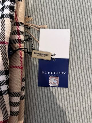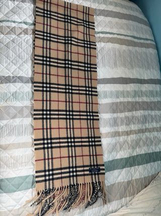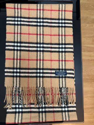 Bufanda clásica de Burberry con su icónico estampado. - Diseño a cuadros en tonos beige, negro y rojo. - Acabado con flecos en los extremos. - Incluye etiqueta original.