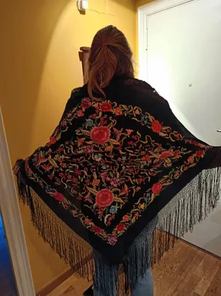 Elegante mantón con un diseño sutil y flecos decorativos. Hace 1,05x1,01 - Material suave al tacto. - Diseño con pequeños motivos. - Flecos en todos los bordes