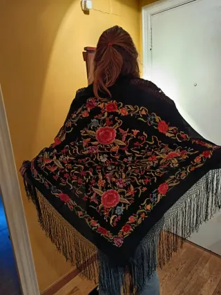 Elegante mantón de Manila de seda con un diseño vibrante y detallado. - Tejido de seda. - Adornado con flecos. - Bordado a mano floral multicolor. - Antiguo - Cuadrado, 1 metro