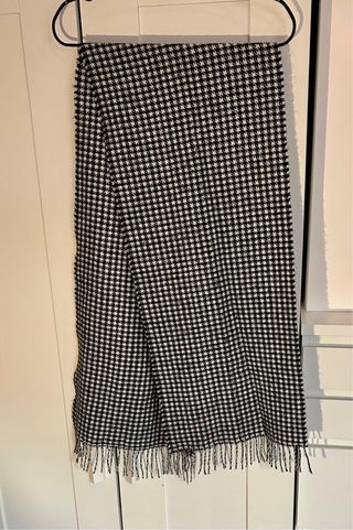 Bufanda fina (no es gruesa, pero sí mas que un fular) Estampado de pata de gallo Marca H&M Colores negro y blanco Acabado con flecos