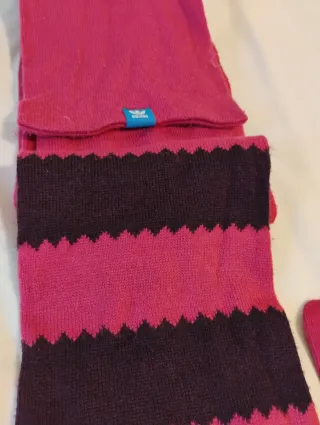 Conjunto de bufanda y guantes de la marca Adidas. - Bufanda con diseño de rayas rosas y negras. - Guantes a juego en color rosa. - Logo de Adidas en ambos artículos.