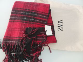 Bufanda de cuadros de Zara para caballero. - Diseño a cuadros en rojo y negro. - Con flecos en los extremos.