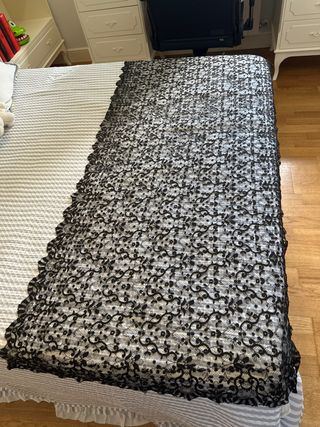 Preciosa toquilla calada con un diseño floral. Es antigua de 152x53 cm, buen estado - Color negro. - Diseño calado. - Adorno con flores y volantes.