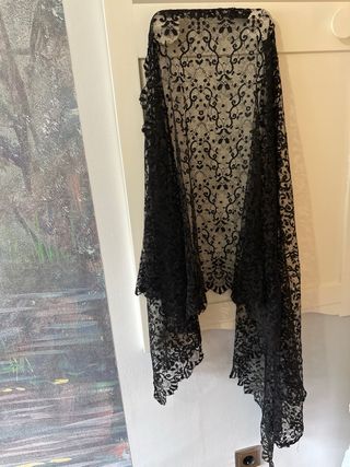 Elegante chal de encaje con un delicado diseño. - Material: Encaje Chantilly. - Color principal: Negro. - Detalle: Diseño floral intrincado. - Medidas: 2 m x 90 cm
