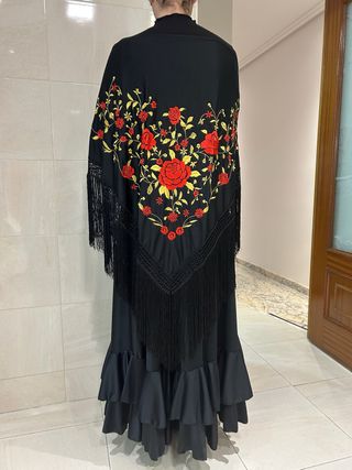 Elegante mantón de pico negro con un precioso bordado floral en tonos rojo y dorado. Presenta un fleco más largo. - Diseño de flores bordadas. - Fleco largo. - Mide 1,60cm de largo y los flecos aparte 25 cm.