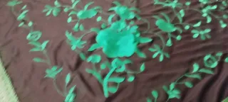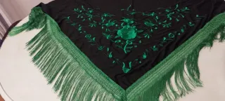 Elegante mantoncillo con un diseño floral bordado. - Base de color negro. - Bordado en hilo verde. - Adornado con flecos largos en los bordos.