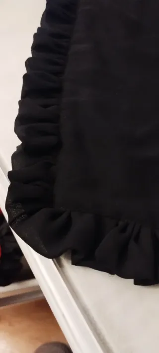 Manton con un diseño de lunares.para encima los hombros - Diseño de lunares negros sobre fondo rojo. - Borde con volantes negros.