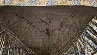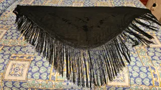 Precioso mantón de Manila con un intrincado bordado floral sobre fondo negro. Un accesorio elegante y llamativo. - Diseño floral multicolor. - Bordado detallado.