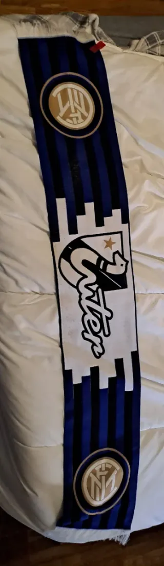 Bufanda del Inter de Milán con los colores clásicos del equipo. - Diseño con el escudo del Inter. - Rayas verticales azules y negras.