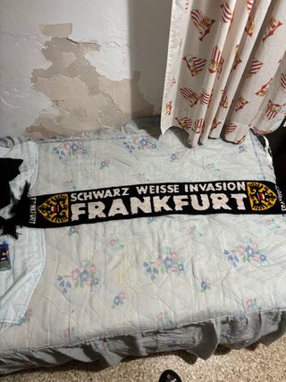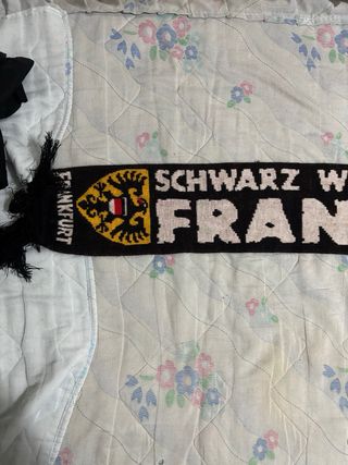 Bufanda retro del equipo de fútbol de Frankfurt. - Diseño Schwarz Weisse Invasion. - Colores negro y amarillo. - Con escudo del equipo en los extremos.