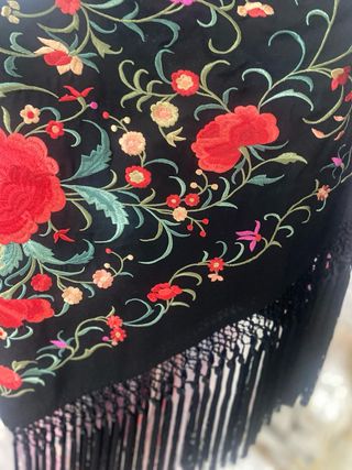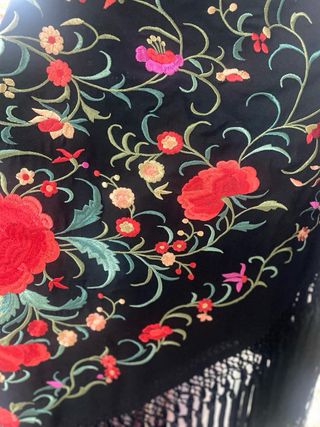 Manton negro bordado flores rojas y doradas