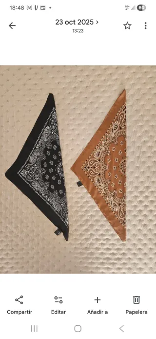Dos pañuelos. COMO NUEVOS, un solo uso. Bandana negra y bandana marron. Estilo saten, estampado cachemir. Sirve como pañuelo para el cuello como pañuelo para la cabeza. Medidas 54cmx54cm. Si entras en mi perfil y te llevas otro articulo te hago descuento