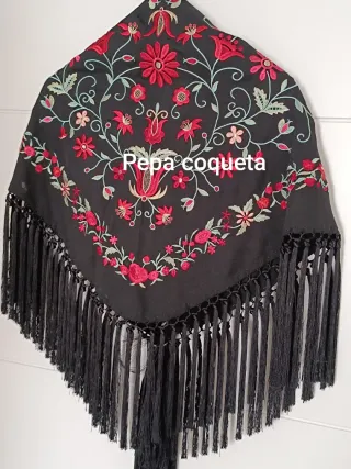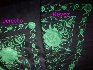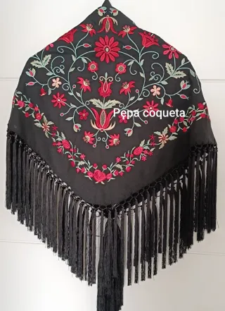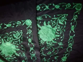mantoncillo negro con bordados florales para la feria. Tamaño para adultos Solo usado un dia de feria. No hay marcas de broche ni alfileres. Ningún desperfecto. - Bordados de flores y hojas.