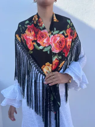 Elegante mantoncillo con un vibrante estampado floral sobre fondo negro. Perfecto para añadir un toque de color y estilo a cualquier atuendo. - Diseño de rosas en tonos rojos, naranjas y amarillos. - Adornado con flecos largos y detalle de encaje en el borde.