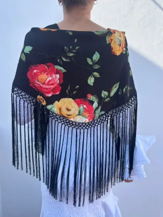 Mantoncillos flamencos con un diseño floral vibrante y flecos largos. - Estampado de rosas rojas, amarillas y rosas sobre fondo negro. - Flecos negros que añaden movimiento. - Ideal para trajes de flamenca o como accesorio de moda.
