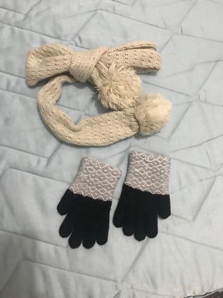 bufanda y guantes para bebé de 2 años. La bufanda es de punto beige con detalles de pompón y los guantes son de punto negro con la parte superior de encaje color crema y botones en negro. - Bufanda de punto beige. - Guantes de punto negro y gris.
