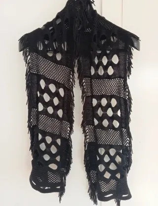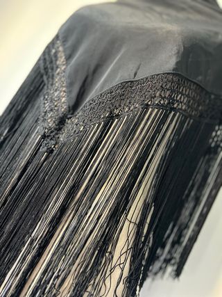Elegante chal negro con un intrincado diseño de encaje y flecos largos. - Diseño de encaje calado. - Flecos largos y anudados en los extremos. - Tejido suave y ligero. - Muy largo y estrecho: aprox. 2,14 m de largo x 51 cm de ancho, flecos de unos 35 cm. - Ideal para fiestas, ceremonias, traje regional o flamenca. - Muy poco uso y en perfecto estado.. #manton #chal #lana #negro #artesania #fiesta #ceremonia #valencia