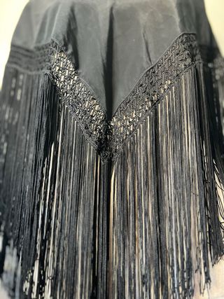 Antiguo mantón de lana negra para indumentaria tradicional. Algún desperfecto mostrado en las imágenes. MEDIDAS: 1,70 m, más unos 11 cm de los flecos. NO ENVÍO POR WALLAPOP, SOLO POR CORREOS CERTIFICADO O ENTREGA EN MANO EN VALENCIA CAPITAL.