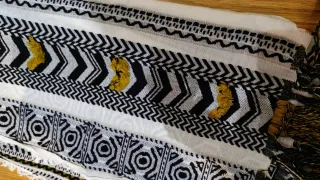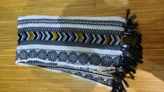 Bufanda con un diseño étnico y moderno. - Estampado geométrico en blanco y negro. - Detalles en hilo dorado. - Flecos decorativos en los extremos.
