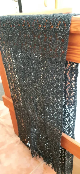 Bufanda de crochet con un diseño delicado y detalles brillantes. Perfecta para añadir un toque de elegancia a cualquier atuendo. - Tejido con hilo que incluye hebras plateadas. - Diseño calado. - Flecos en los extremos.