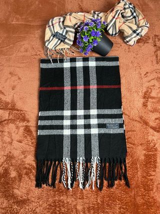Bufanda de lana con el icónico estampado tartán de Burberry. - Diseño clásico en tonos beige, negro y rojo. - Acabado con flecos en los extremos. - Suave al tacto.