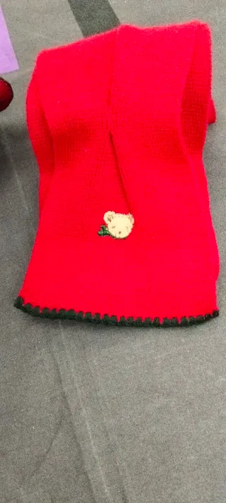 Conjunto de gorro y bufanda de estilo colegiala. - Gorro con orejitas y pompón. - Bufanda con detalles de pompón. - Adorno de osito en gorro y bufanda.