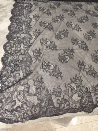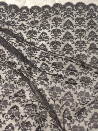 Elegante mantilla de encaje negro para adulta, con un delicado diseño floral. - Encaje intrincado con motivos florales y hojas. - Diseño de estilo clásico. - Ideal para indumentaria fallera -Medidas 1'20/ 2'40